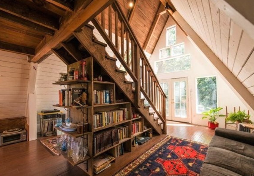 Компактная конструкция лестницы не подходит для пожилых людей и детей. Поэтому для удобства подъема и спуска придется поставить маршевую лестницу и подумать, как использовать пространство под ней. Обычно здесь размещают кладовки или санузлы.