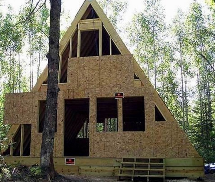 Классика конструкции треугольного дома — утепленный деревянный рамный каркас. Его покрывают водонепроницаемым материалом. Решения с фронтонами из бруса и кирпича встречаются реже.
