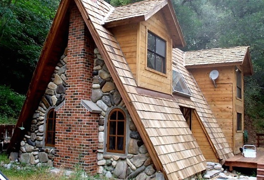 Шалашная крыша позволяет сделать два жилых уровня, экономя площадь участка. По этой причине а образные дома столь популярны на небольших дачах. Теперь, когда вы усвоили, как называется дом с крышей до земли, посмотрим на его особенности. Второй этаж требует установки лестницы и усложняет перемещение между помещениями.