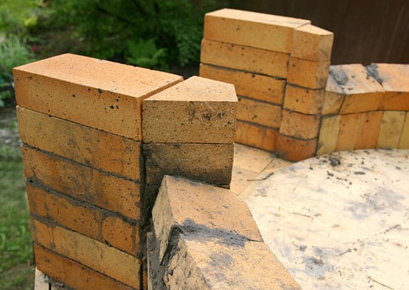На фото справа видны первые ряды кладки свода (кирпич идет кольцами и под углом) , а также кладка устья печи — слева